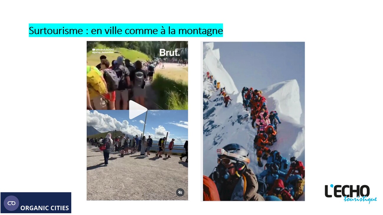 A gauche, vous avez une image des Dolomites l’été dernier. Ces randonneurs s’acheminent sur un sentier pour aller vers un spot instagrammable. Quelques habitants se sont rebellés et ont décidé d’installer un tourniquet payant de 5 euros. C’était une forme de provocation. Pourquoi ? Parce que certains randonneurs traversaient des terrains privés. Ils étaient assez irrespectueux. Finalement, les habitants ont décidé de manifester leur mécontentement par rapport au manque de courage politique. Cette situation ne relève pas du tourisme de masse, mais de l’inaction des pouvoirs publics, alors qu’il faut prendre des mesures pour éviter que ce genre de situation se produise.