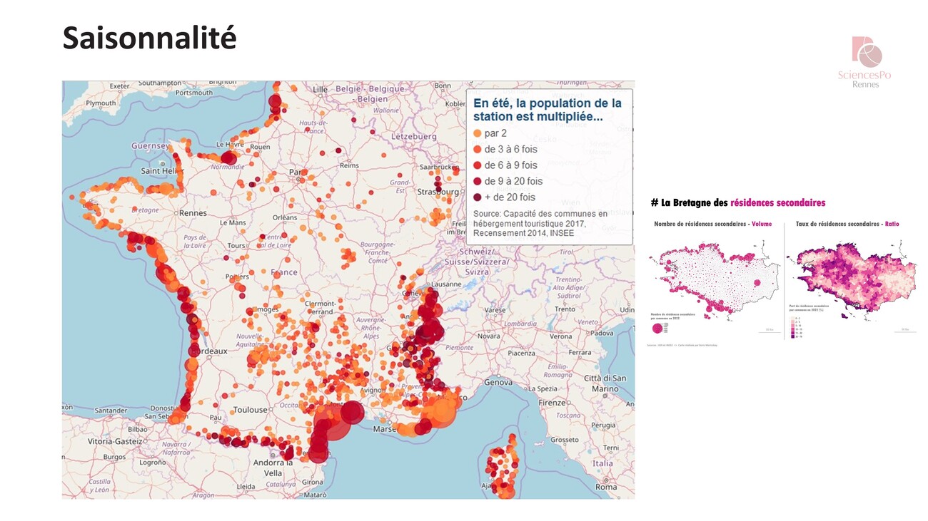 Dernier point à l’échelle de cette façade littorale, c’est la saisonnalité très marquée. Cette carte nous montre le facteur de multiplication de la population en fonction des stations. On a des situations assez hétérogènes, avec une population multipliée par deux à plus de 20 fois.