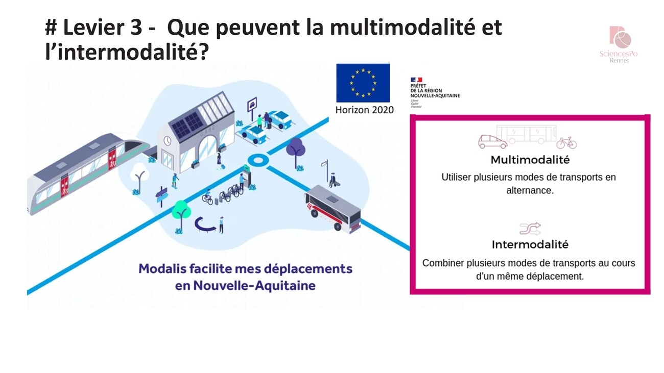 Troisième levier, la multimodalité et l’intermodalité : on va pouvoir utiliser plusieurs modes de transport en alternance en fonction des raisons pour lesquelles on se déplace. Et on va combiner plusieurs modes de transport au cours d’un même déplacement.