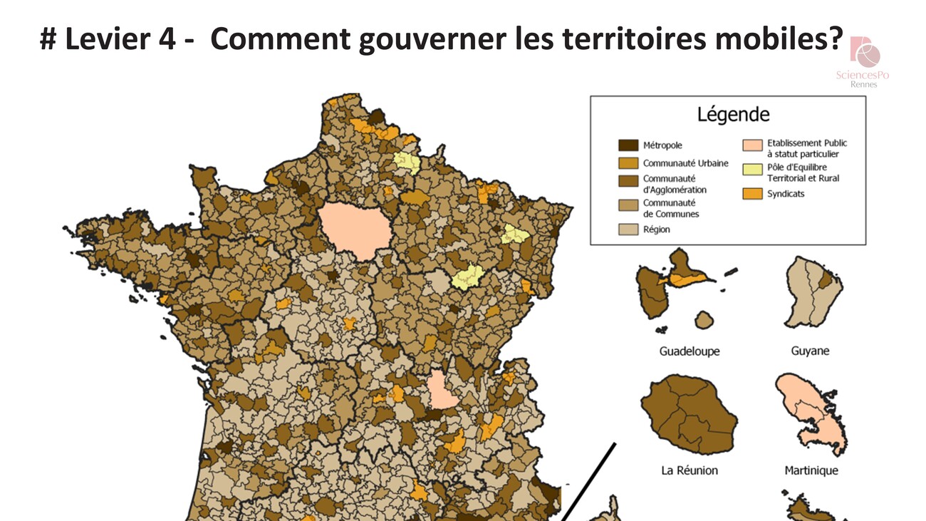 Le quatrième levier est celui de la gouvernance des territoires mobiles. Je reproduis cette carte qui montre le découpage administratif des autorités organisatrices de la mobilité en France. Et si vous vous rappelez la carte qu’on a affichée au tout début sur les flux de plus de déplacements compris entre 20 km et 200 km, on voit qu’on n’est pas du tout sur une superposition des périmètres. Se pose donc la question des bassins de vie et de la nécessité d’élargir le rayon d’action des autorités locales au-delà de leurs périmètres administratifs. Pour faire simple et forcément caricatural, alors que les logiques de déplacements dépassent les systèmes administratifs, la logique reste à l’organisation des systèmes de mobilité pour ceux qui votent.
