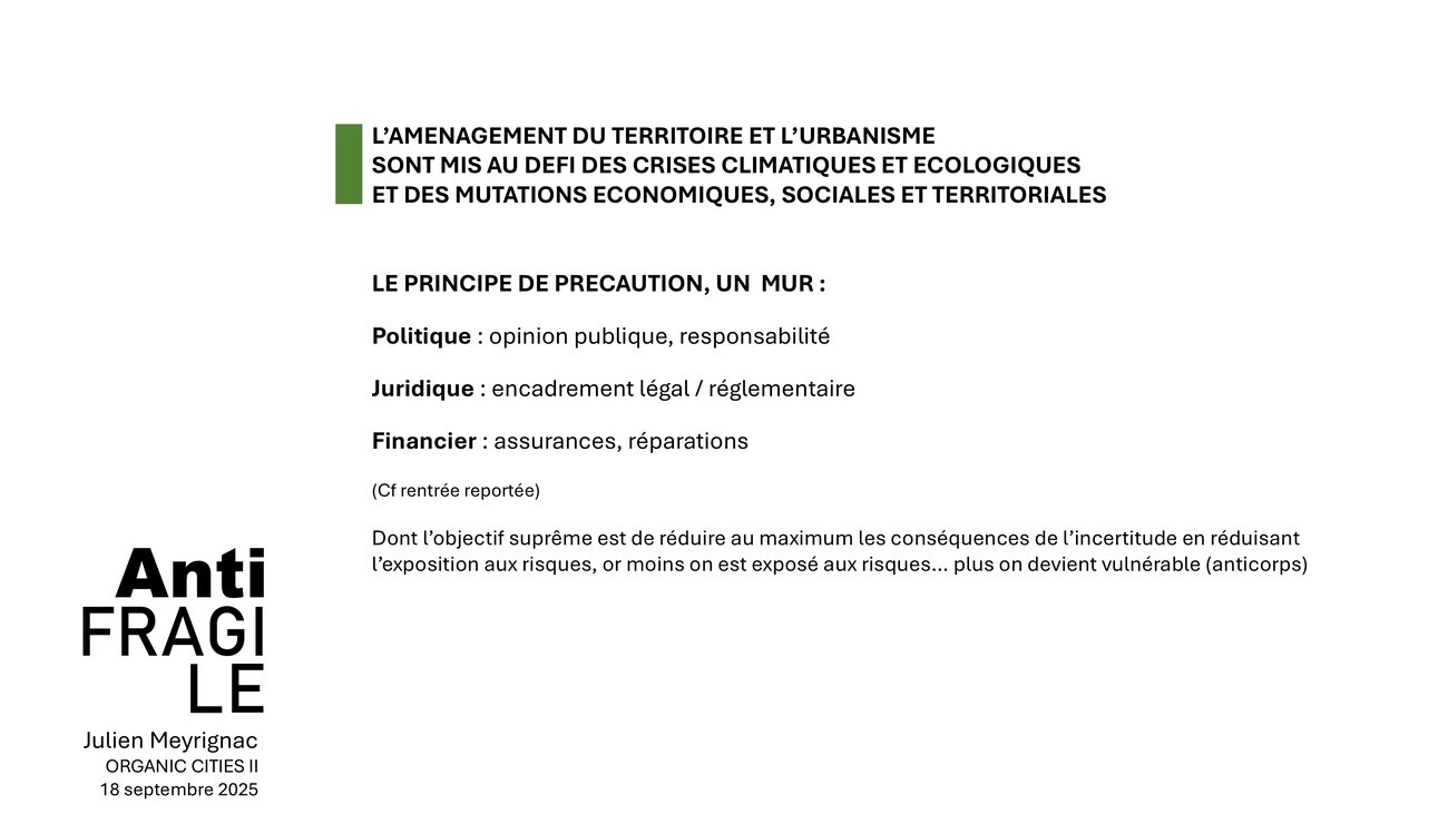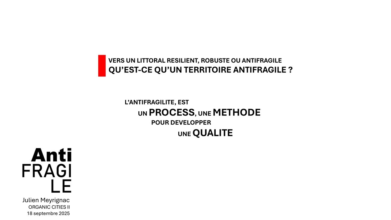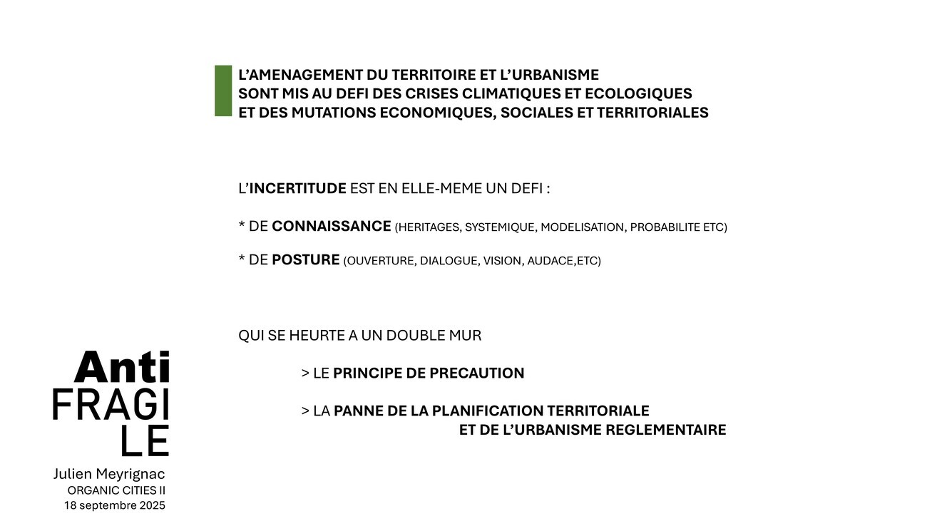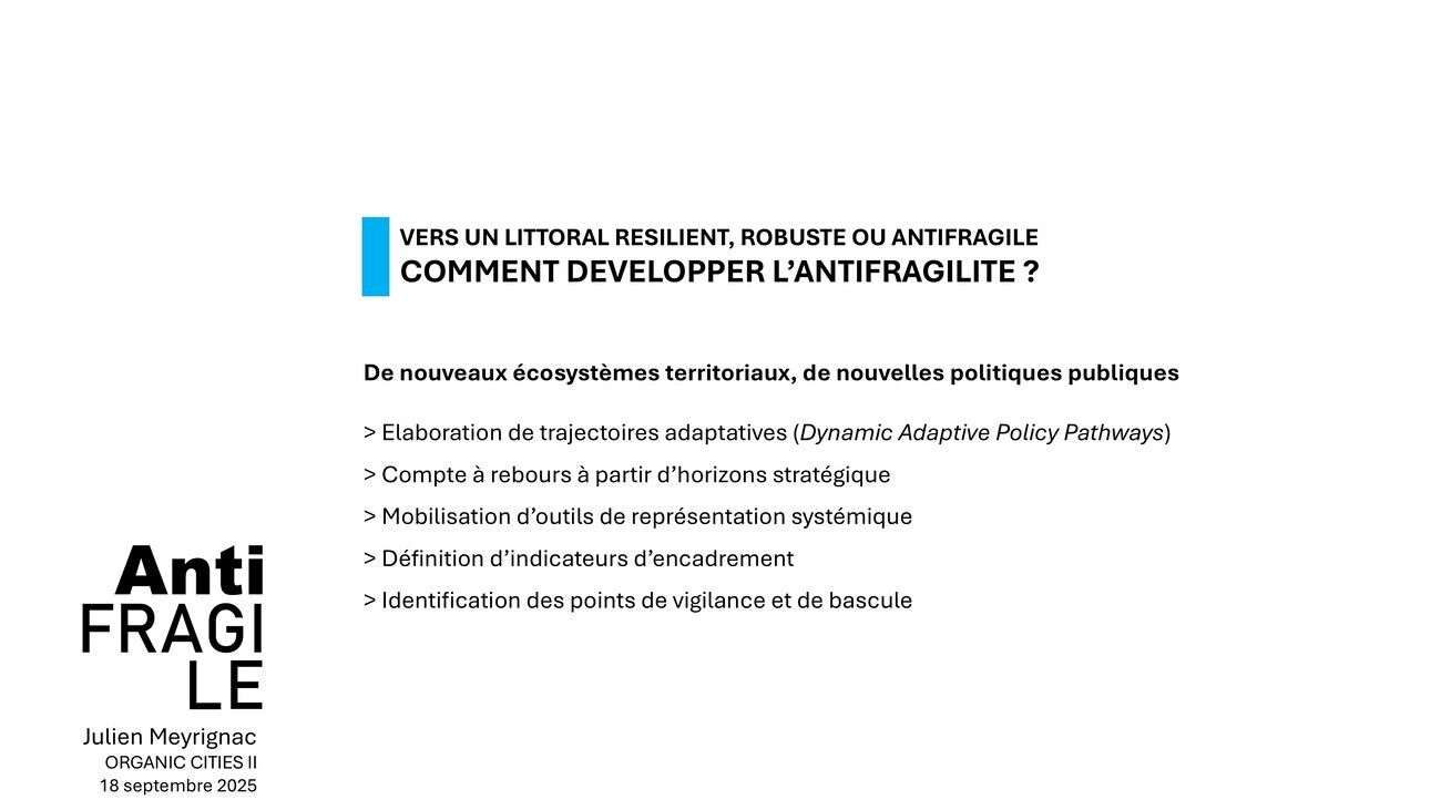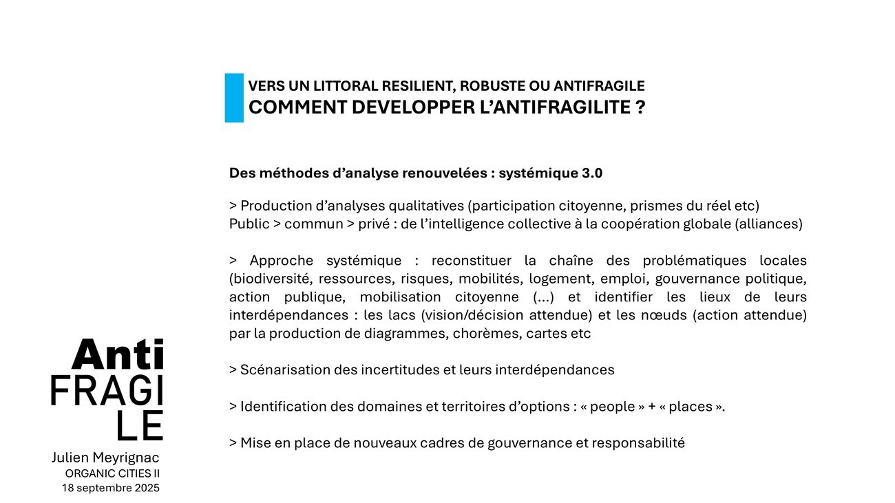 Quelques éléments de méthode à présent. L’antifragilité, pour moi, cela doit être une nouvelle façon de pratiquer l’urbanisme, peut-être jusqu’à changer son nom – ce serait l’objet d’un colloque à part je crois – mais peut-être que si on l’appelait le climaxisme… Je lance des pistes, on en discute tout à l’heure.