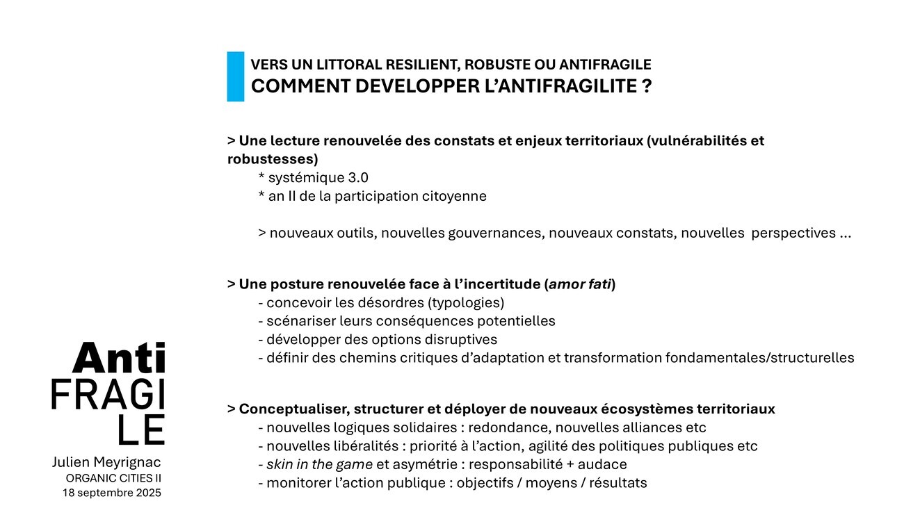 Et si c’est de la transformation, vous l’avez compris, c’est un process, une méthode pour développer une qualité. Quand on dit une ville ou un territoire antifragile, cela ne peut pas être une dimension constituante. En revanche, il peut y avoir des politiques d’antifragilité qui vont permettre de faire, de développer un territoire.