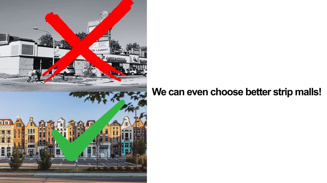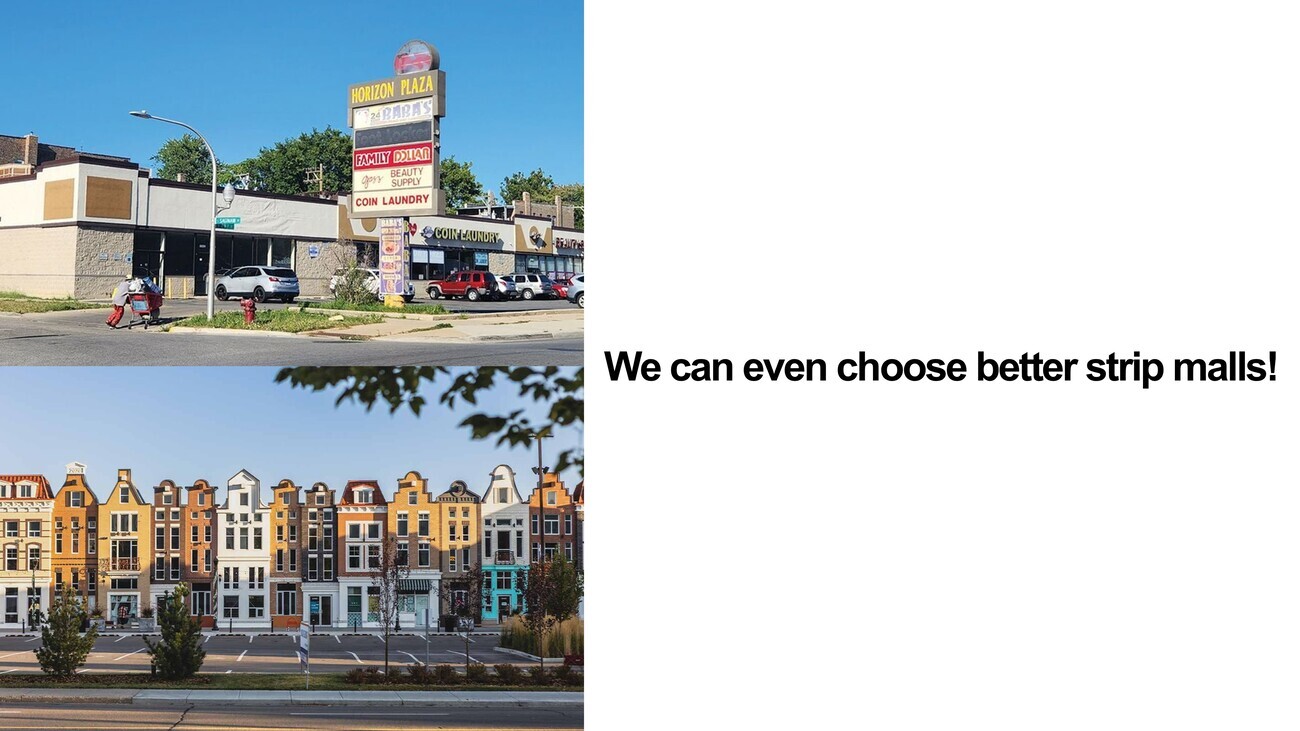 We have a new residential college at Yale on the top right. We have infill housing what we would call in the middle and the bottom right. And we have single-family homes on the bottom middle and the bottom left. These are two of the most extraordinary projects anywhere in North America. The project in the middle is by an architect called Jeff Shelton, who I think is one of the most excellent practicing architects in America today. And that was built on the space of two parking spaces. So you can take 300 square feet, 400 square feet, a postage stamp, and create something that wonderful. And we can even choose to build better strip malls—again, very American. We don’t have to default to the status quo. We can build stuff that looks like maybe it’s a little too twee as a picturesque Dutch village, but it can be quite wonderful.