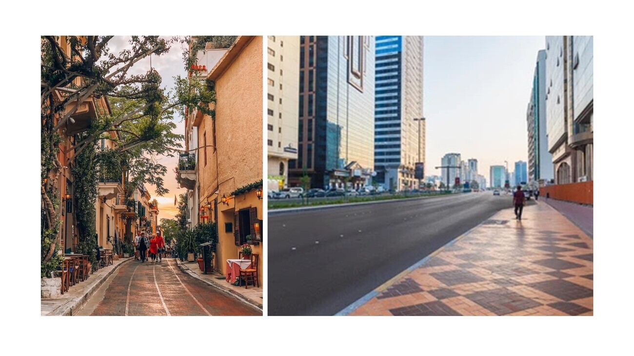 And in order to represent that, I have this juxtaposition. Here on the left, we have what would be perceived as on this continent a lovely, but a pretty generic street. In America, it would classify as one of the best streets in the country, probably one of the 15 best. And on the right is the ground level of a city that is heralded for architecture. Does anybody know what city this is when you’re not looking at the skyline? You can shout it out if anybody has a guess. Anybody know? Brasilia, could guess. No, but it’s similar philosophy. Could be Vegas. I mean, it could be any of these places, right? This is Dubai. This is the view they never show you of Dubai. It is the ground level where nobody wants to spend much time. You’re on subways. You’re in hypercars. You’re looking upwards. You’re never looking down and that’s the way they want it for a reason.