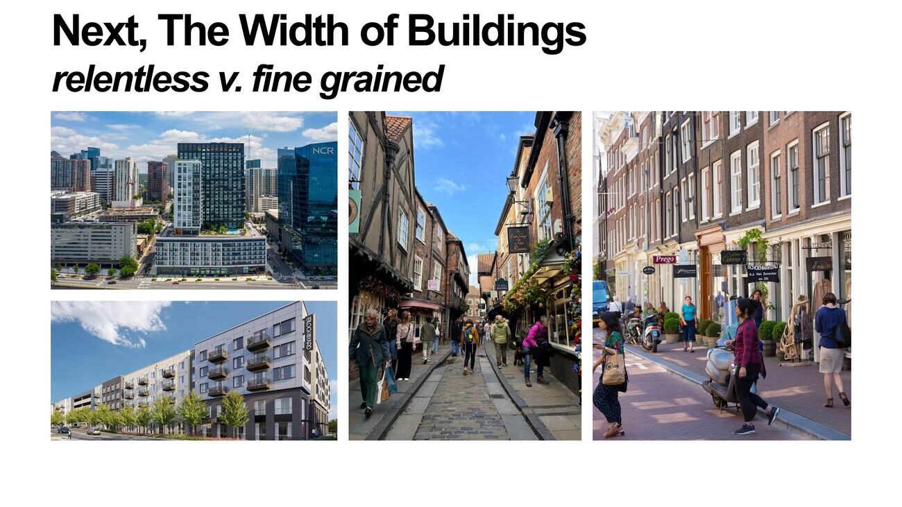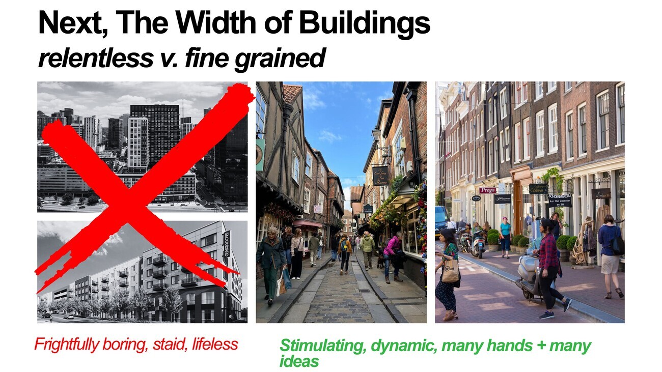 So once we get those foundations right, we need to think about the grain of a city as urban planners. We’d love to talk about the width or interfaces between structures, the right-of-way, and how wide these buildings are. We have a ton of structures that are really quite wide and quite imposing, even relentless in the North American context, and the architecture is really poor, of course. But I think what’s doing most of the work here is that they go on forever. They’re sort of oppressive. And if they were 20 feet wide, 30 feet wide, the quality of the architecture would not impact us nearly as much. Now of course, we have beautiful streets here in York and in Amsterdam. But I think far more of the reason why we like these streets is because they get the small things, right? This is boring, stayed, lifeless. There’s nobody on the streets. And on the right, I didn’t just selectively choose these pictures at an opportune time. They’re wonderful and they’re vibrant.