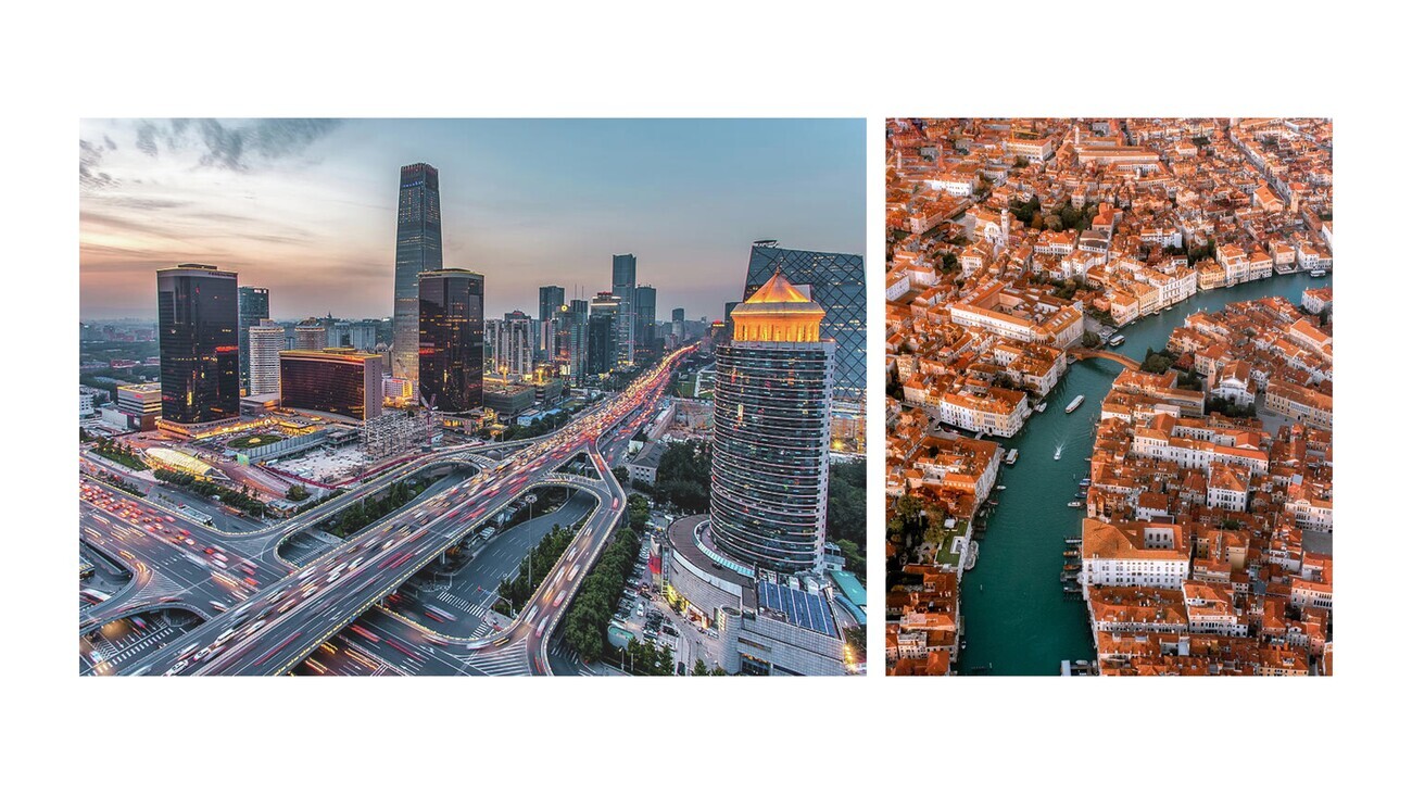 This is another version of that dichotomy. This on the left, I believe is Beijing though I could be wrong, and it’s a city that’s invested tens to hundreds of billions of dollars in its built environment. But it’s a place where one could scarcely recall any notable landmarks. Maybe you have the Bird’s Nest and you have the CCP headquarters. But it’s really a city that’s rather unremarkable as opposed to somewhere like Venice in a far smaller built area that packs much higher punch.