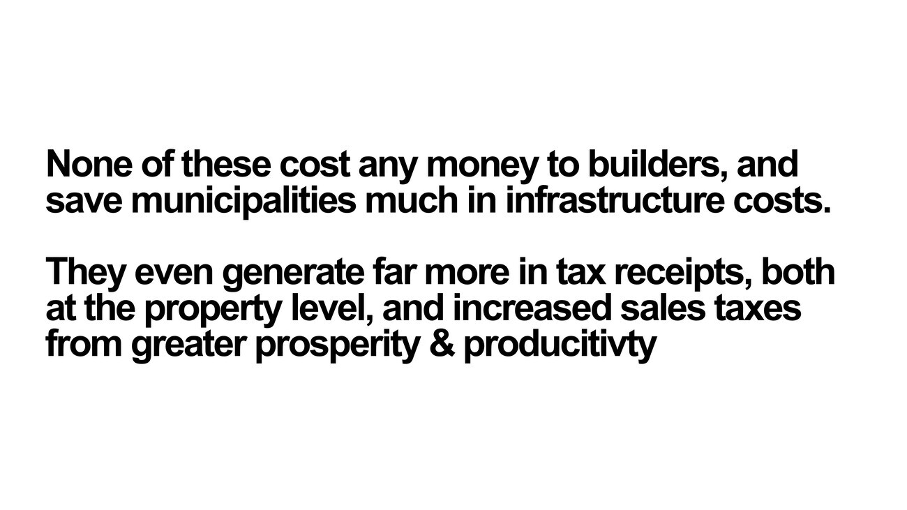 So as a developer and as a planner – I try to take both of those hats on and off – none of these things that I’ve shown really cost all that much more money. Sure, planting a couple of trees has some input costs. They have some maintenance costs. I’m not ignorant of that. But all these things have more to do with the fabric of a city without the construction of it. The buildings, the urban design, the greenery comes afterwards, and yet they are incredibly value-accretive in a way that I think surprises people: at least increased sales taxes, increased prosperity, increased productivity, and it might increase the fertility rate if we have enough people that are kissing in those trees.
