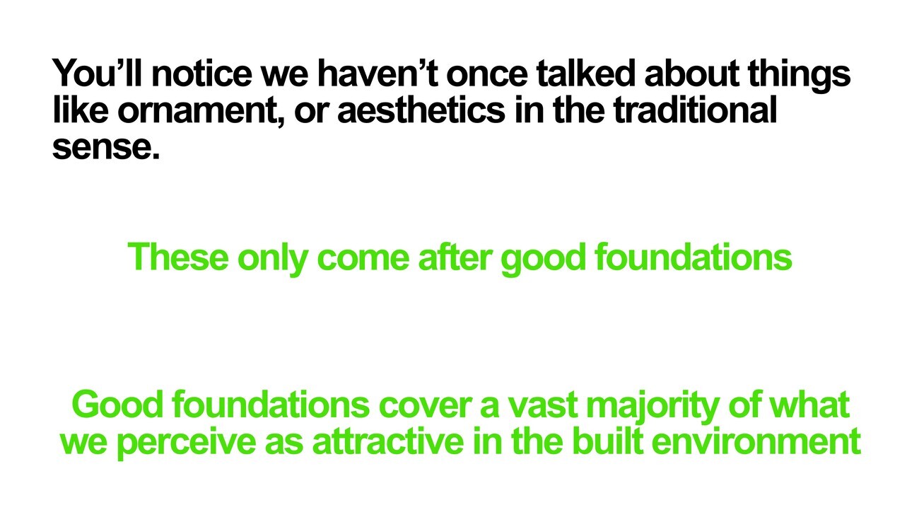 But you’ll notice when we traditionally talk about aesthetics in architecture, decoration or ornament is raised, and I’ve not done any of that so far purposefully. These things only come after we get the foundation of cities, right? We can afford great urbanism because it doesn’t cost that much. Architecture on the other hand, comes after.