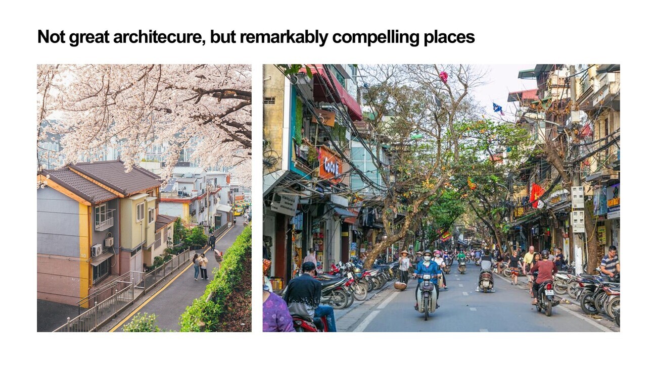 These are two really wonderful street scenes, one in Kyoto on the left, and the right I believe is Ho Chi Minh City. The individual buildings are not good. I mean, there’s some interesting roof orientation in the image on the left, but a lot of the work is coming from the trees. It’s coming from the fine grain. It’s coming from the street width. That’s what leads to attractiveness in cities, and we can do that today.