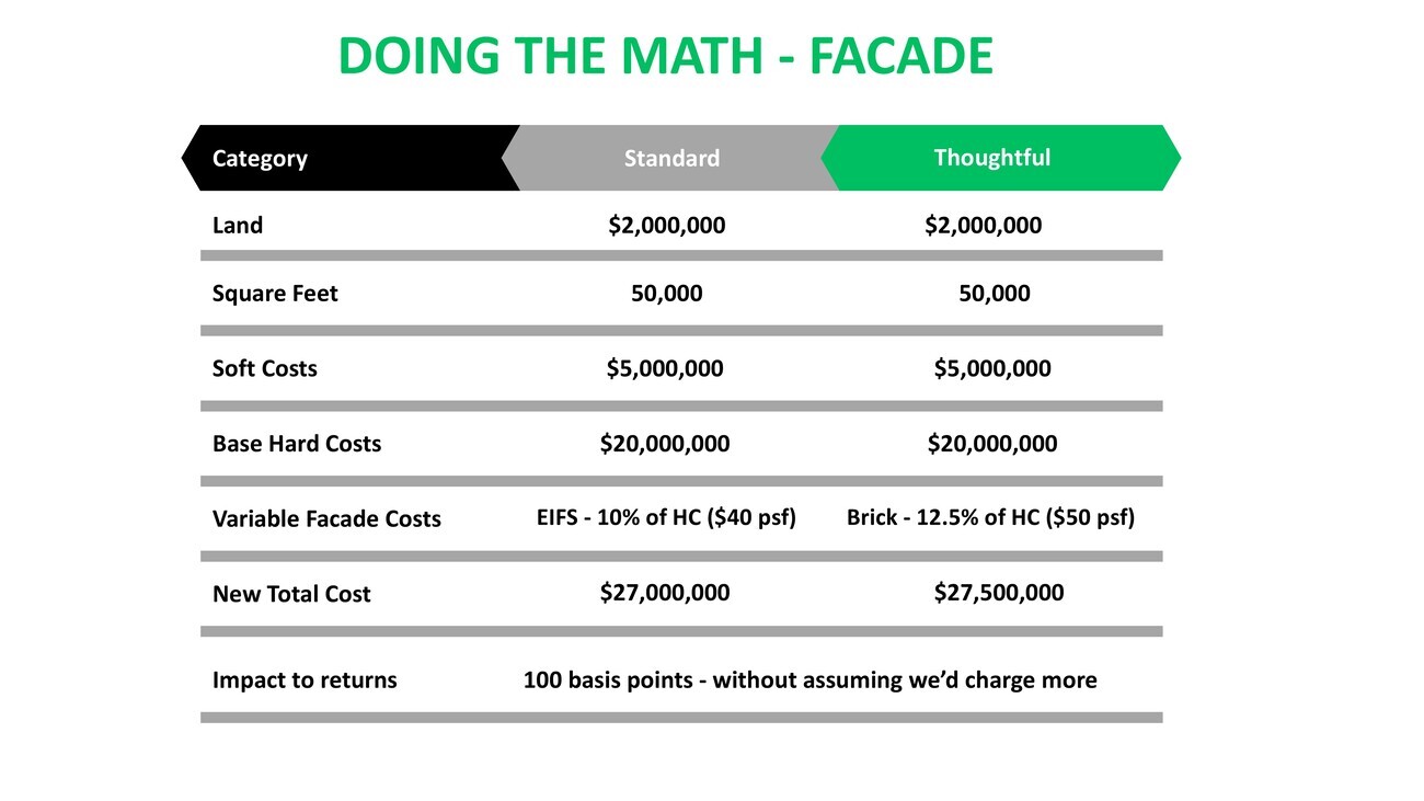 In order to do that, I sort of pull out an element that we look at as developers or as investors in the built environment and I say, is there one part of a structure that we can spend a lot more money on to get that impact? I call it a tactical ornamentation. So if we tactically look at a facade, and instead of doing an EIFS panel [Exterior Insulation and Finish System], which I’ll show you in a next slide, we opt for brick. It adds a lot more cost to the variable to the singular element, but on the project level it really doesn’t add much, right? It’s nominal. Half a million dollars is a lot of money. I don’t mean to diminish that, but on a project the scale, it really isn’t that much.