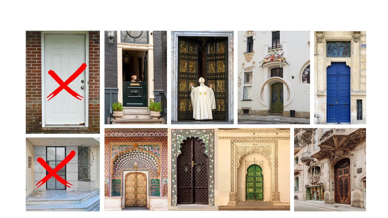 We don’t have to have the overly utilitarian front doors like we see on the left on the bottom left. Maybe they chose to do something a little bit more elevated, but it’s not quite for me. We can tactically spend those dollars so a dog can pop his head out front, right? So the Pope can enter into St. Peter’s. So that we can celebrate these realms of transition that would otherwise be terribly normal.