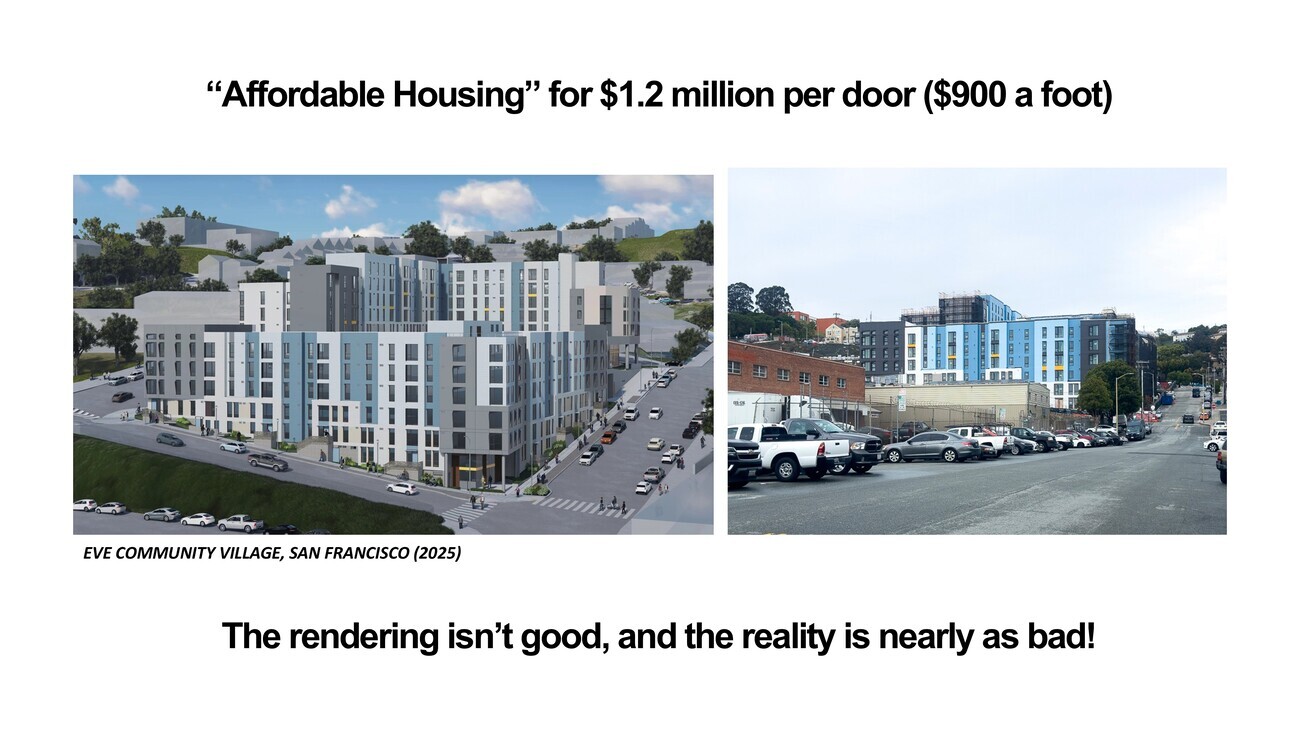 And then we have examples like this where we spend a lot of money for buildings that don’t look very good. And I don’t mean to make fun of San Francisco here. It’s just there’s a number of reasons why this is a very expensive project. But at one and a quarter million dollars per door, nearly a thousand dollars per square foot, it is indefensible why this is costing two to three times more than these wonderful vernaculars. So the rendering isn’t good on the left and the reality isn’t much either. And it’s unfortunate because we spent a lot of money on these.