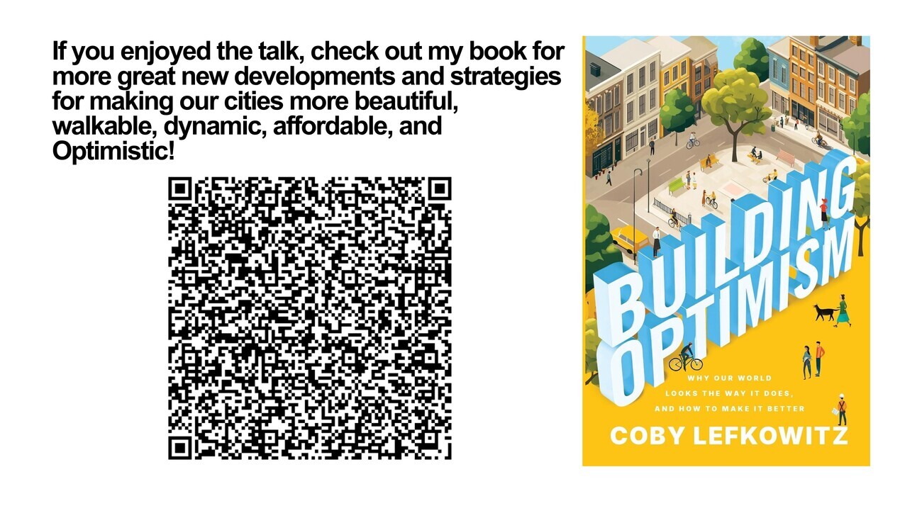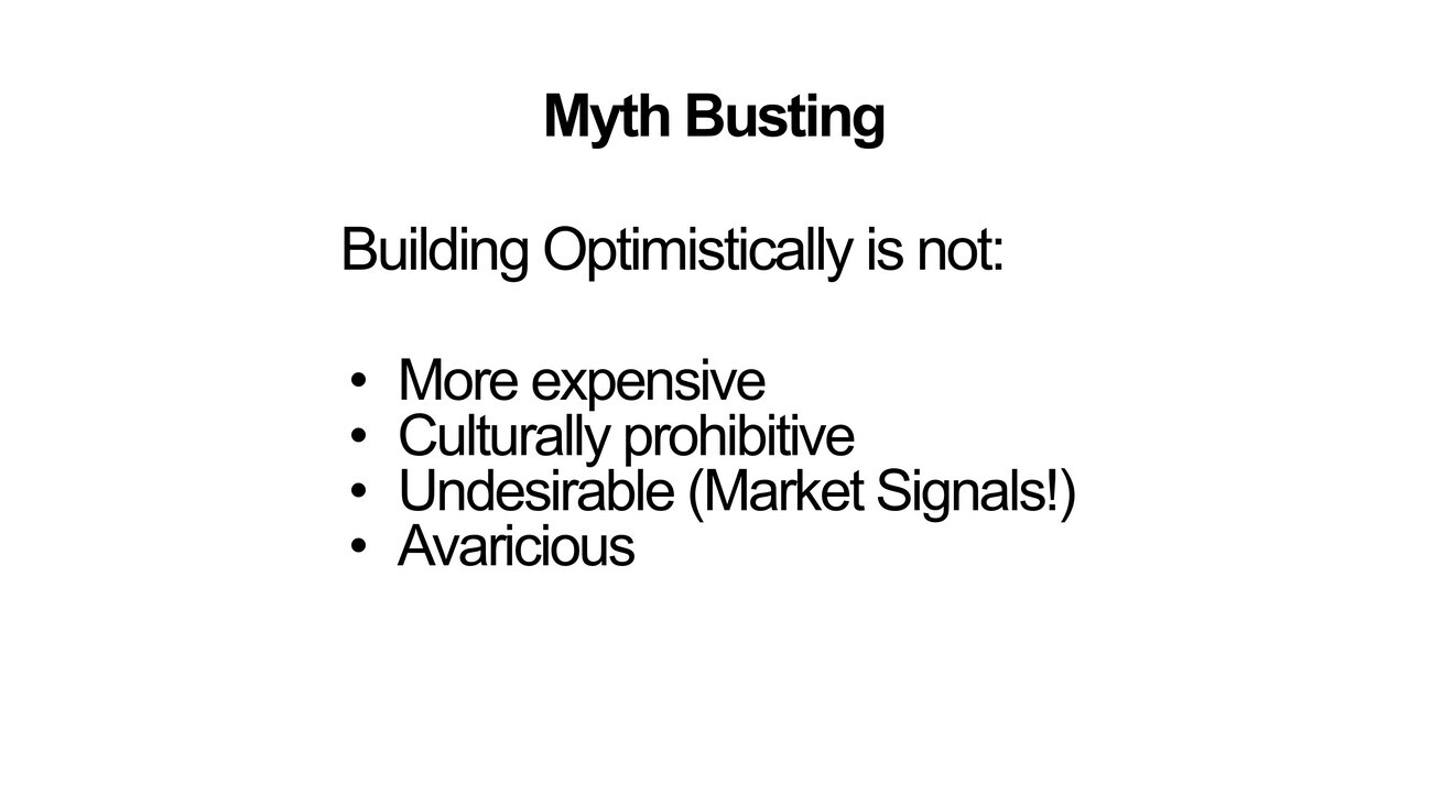 So just to wrap up, building optimistically in these ways that marry the romantic with the pragmatic. It’s not more expensive. It’s not culturally prohibitive. It’s not undesirable. Places like Brooklyn Heights or Back Bay, Boston, which has been invoked a couple times today, are some of the most beautiful places in America. The market knows this, the market pays up for it, and it’s not due to developer greed, but maybe we’ll leave that one for questions and conversation afterwards. It’s a little bit of a provocation to leave you with.
